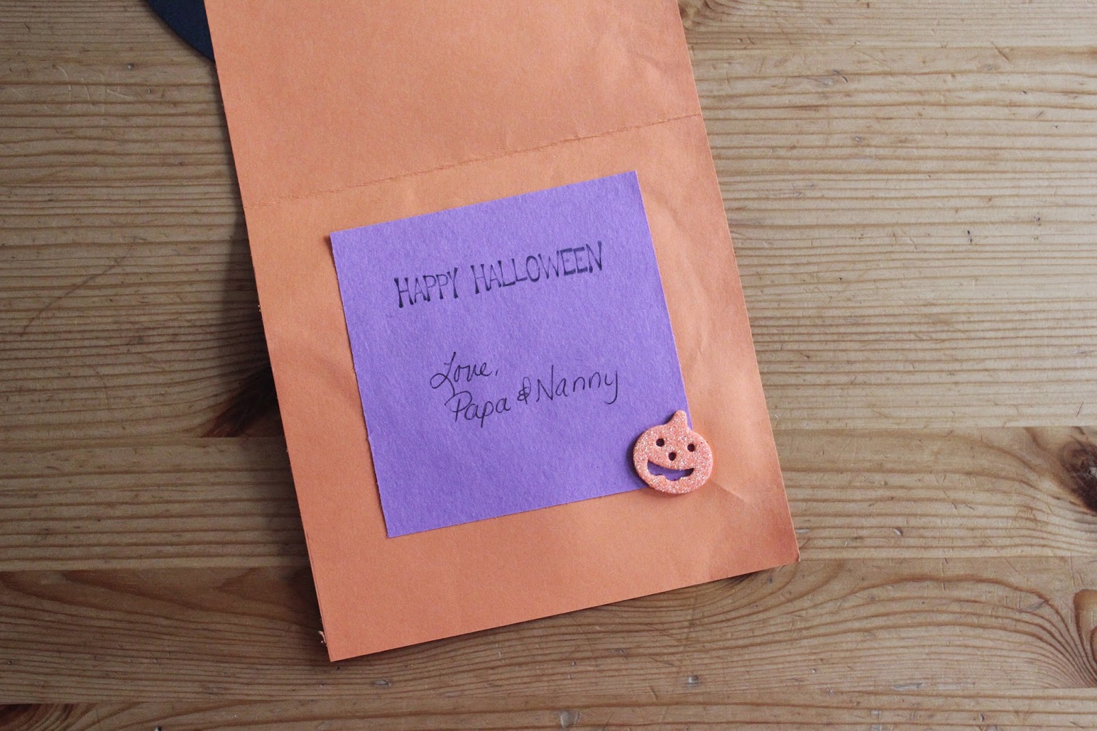 The Pumpkin Card is made from punching out holes in orange and green paper. Draw pumpkin on card and leave space for eyes, nose and mouth.